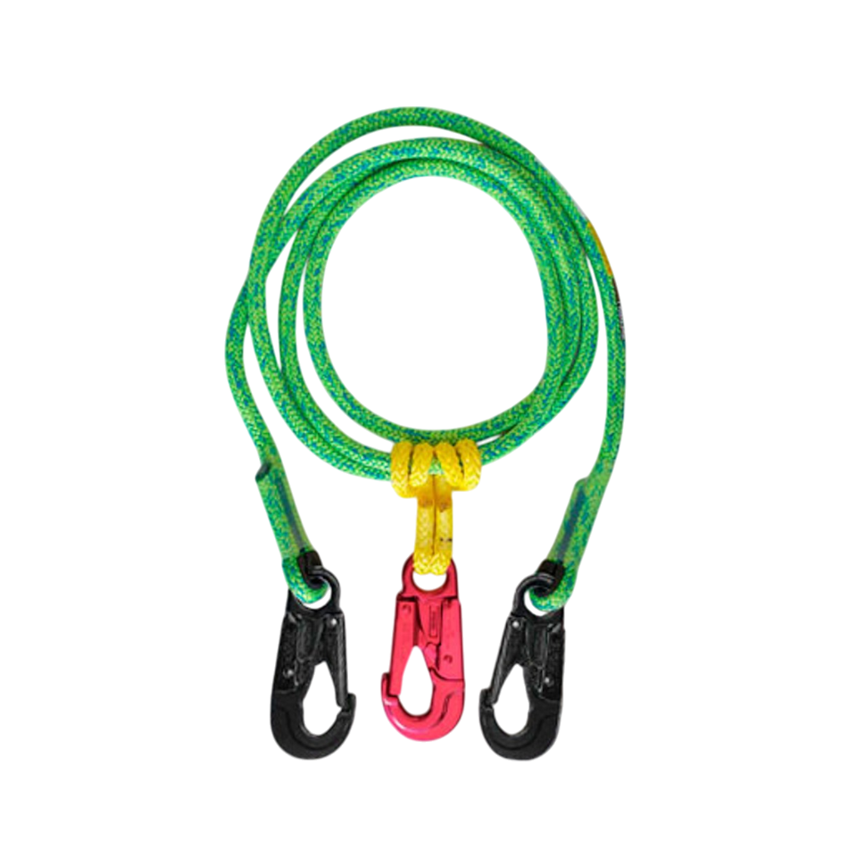 Cuerda con núcleo en textil de 13 mm, con Prusik regulable amarillo que permite al trabajador posicionarse y desplazarse de manera eficiente y segura en el árbol, con ganchos en aluminio con empalme tipo Grizzly, excede los resquisitos de ANSI Z133