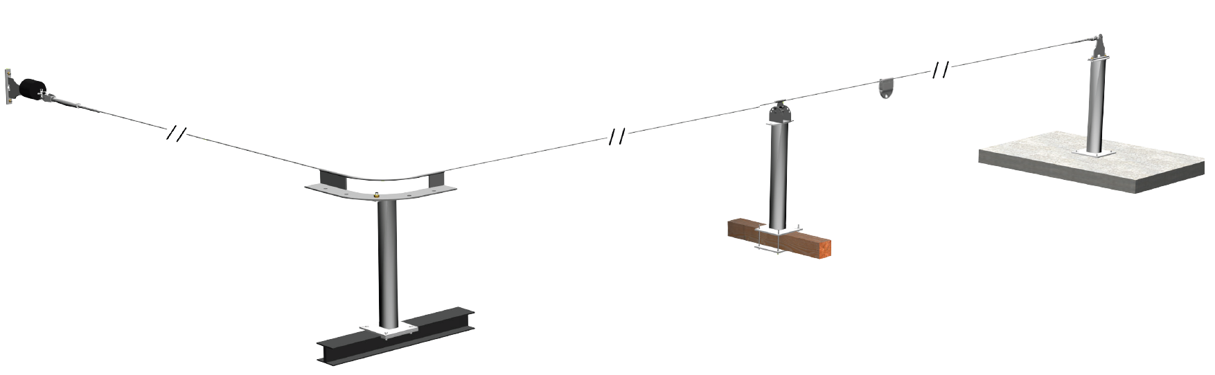 El equipo se compone de un cable de acero inoxidable de 8 mm de diámetro cuyos extremos llevan una clavija y un tensor para engarzar. El intervalo mínimo autorizado entre dos fijaciones es de 5 m y el máximo autorizado es de 15 m. Las correderas FA 60 206 00 y FA 60 206 01 permiten el paso de puntos intermedios de forma automática sin que el usuario tenga que desengancharse. En caso de detención de una caída, gracias a su deformación, el absorbedor de energía permite reducir los esfuerzos transmitidos a la estructura. Esta deformación también sirve de testigo de caída, para poder señalar si el dispositivo puede ser utilizado o no.