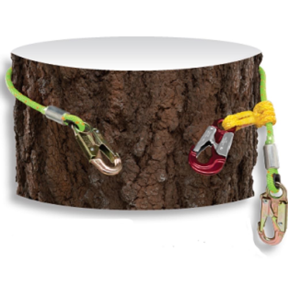 Eslinga con núcleo de acero de 1/2 "con broches de acero de doble acción, Prusik de cadera Tenex y broche de aluminio de doble acción. Viene con núcleo de alambre en los extremos que se presionan hidráulicamente dentro las robustas fundas de metal, retienen aproximadamente el 100% de fuerza nominal .