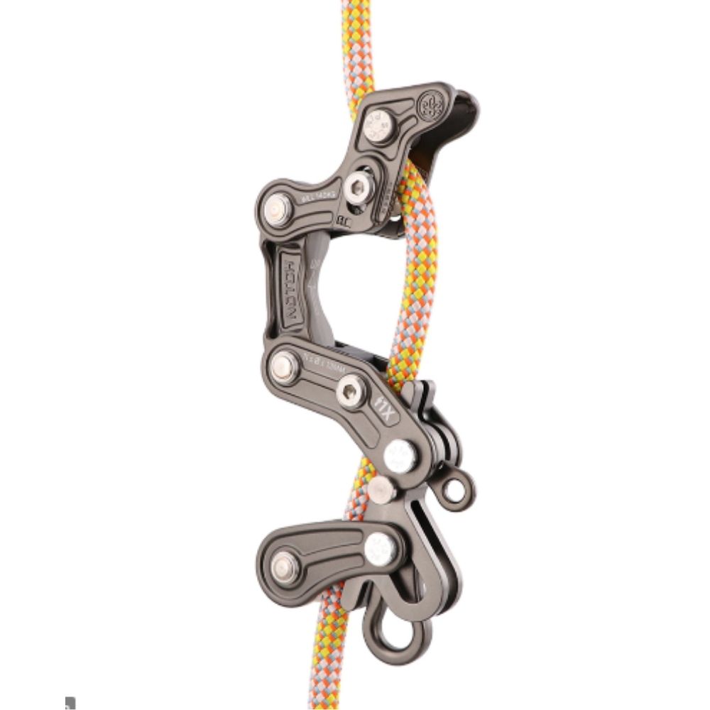 Es un dispositivo mecánico que aplica fricción en tres puntos a lo largo de la cuerda para una sujeción segura y un descenso más suave.