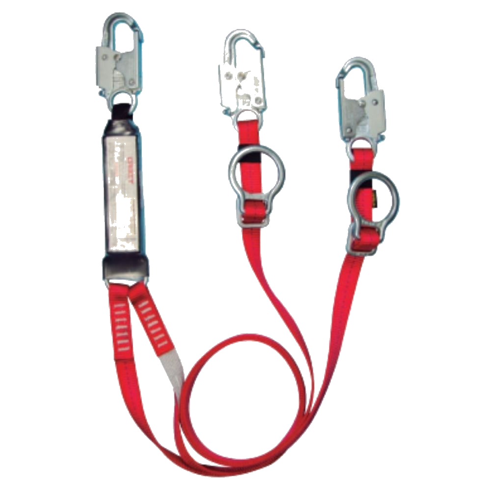 Eslinga de detención de caída en reata de dos brazos tipo Y con sistema de absorción de energía y TIE-BACK, especialmente diseñado para uso de autoamarre, brinda la posibilidad de anclaje a dos estructuras simultáneamente elimina la necesidad de otro conector de anclaje, posee un sistema graduable por medio de una hebilla en acero, útil para regular la longitud de la eslinga y la argolla de TIE-Back para autoamarre, útil para cualquier trabajo en altura superior a 6 metros, cuenta con un gancho de 20 mm de apertura , de doble seguro en acero o aluminio, automáticos o accionamiento con dos movimientos y posee la argolla de TIE-BACK, carga tensil 40 kN.
