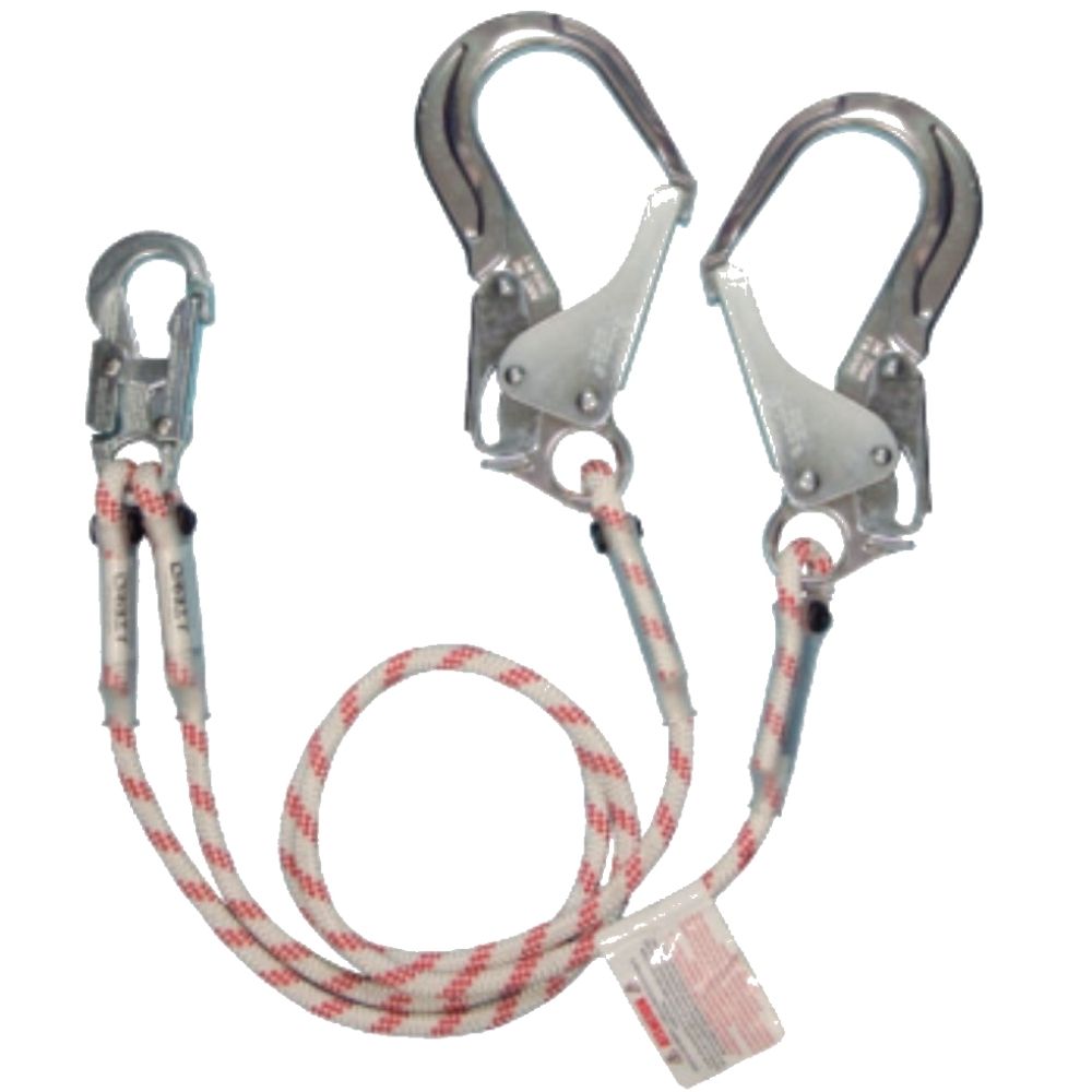 Eslinga de posicionamiento y restricción de dos brazos tipo y en cuerda, se usa para trabajos apoyado sobre las piernas, posibilidad de anclarse a dos estructuras simultáneamente y tener las manos libres, cuenta con dos ganchos de 65 mm de apertura y uno de 20 mm de apertura, que permite el anclaje a estructuras de hasta 60mm de diámetro, los ganchos son de doble seguro en acero o aluminio, automáticos o accionamiento.