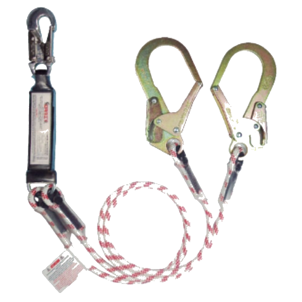 Eslinga de detención a caídas de dos brazos tipo Y en cuerda con sistema de absorción de energía se usa para trabajos apoyado sobre las piernas, posibilidad de anclarse a dos estructuras simultáneamente y de tener las manos libres, cuenta con dos ganchos de 65 mm de apertura y uno de 20 mm de apertura, que permite el anclaje a estructuras entre 50 y 70 mm, los ganchos son de doble segur en acero o aluminio, automáticos o accionamiento con dos movimientos, resistencia tensil 30 kN.