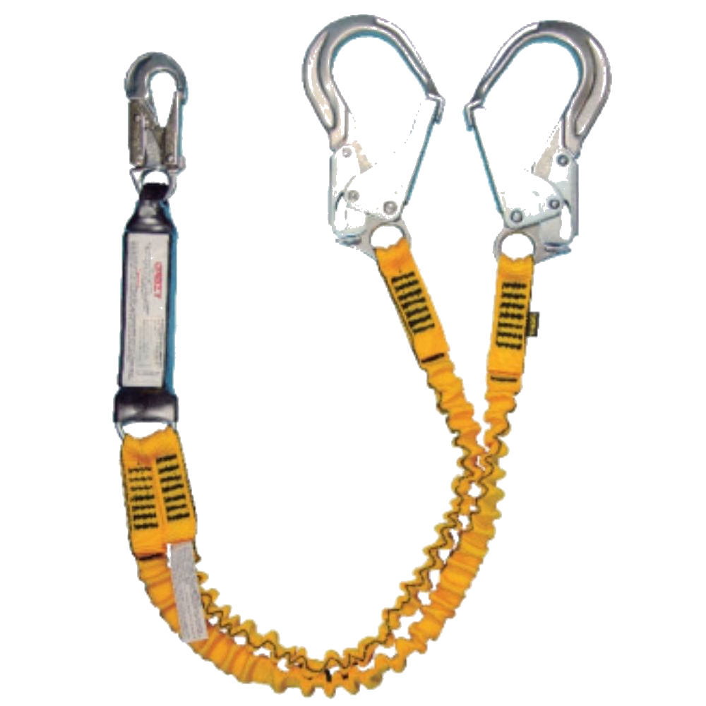 Eslinga de detención de caída en reata resortada de dos brazos tipo Y con sistema de absorción de energía se usa para trabajos estando apoyado sobre las piernas con posibilidad de anclaje a dos estructuras simultáneamente y tener las manos libres, cuenta con dos ganchos de 65 mm de apertura y uno de 20 mm de apertura, de doble seguro en acero o aluminio, automáticos o accionamiento con dos movimientos, incluye paquete de absorción, carga tensil 30 kN.